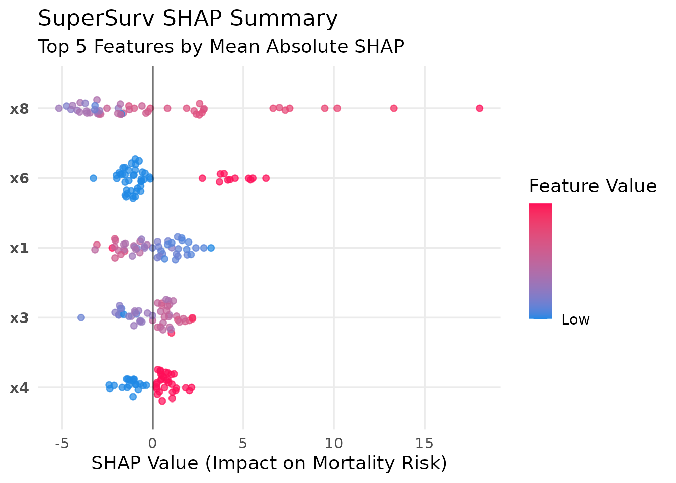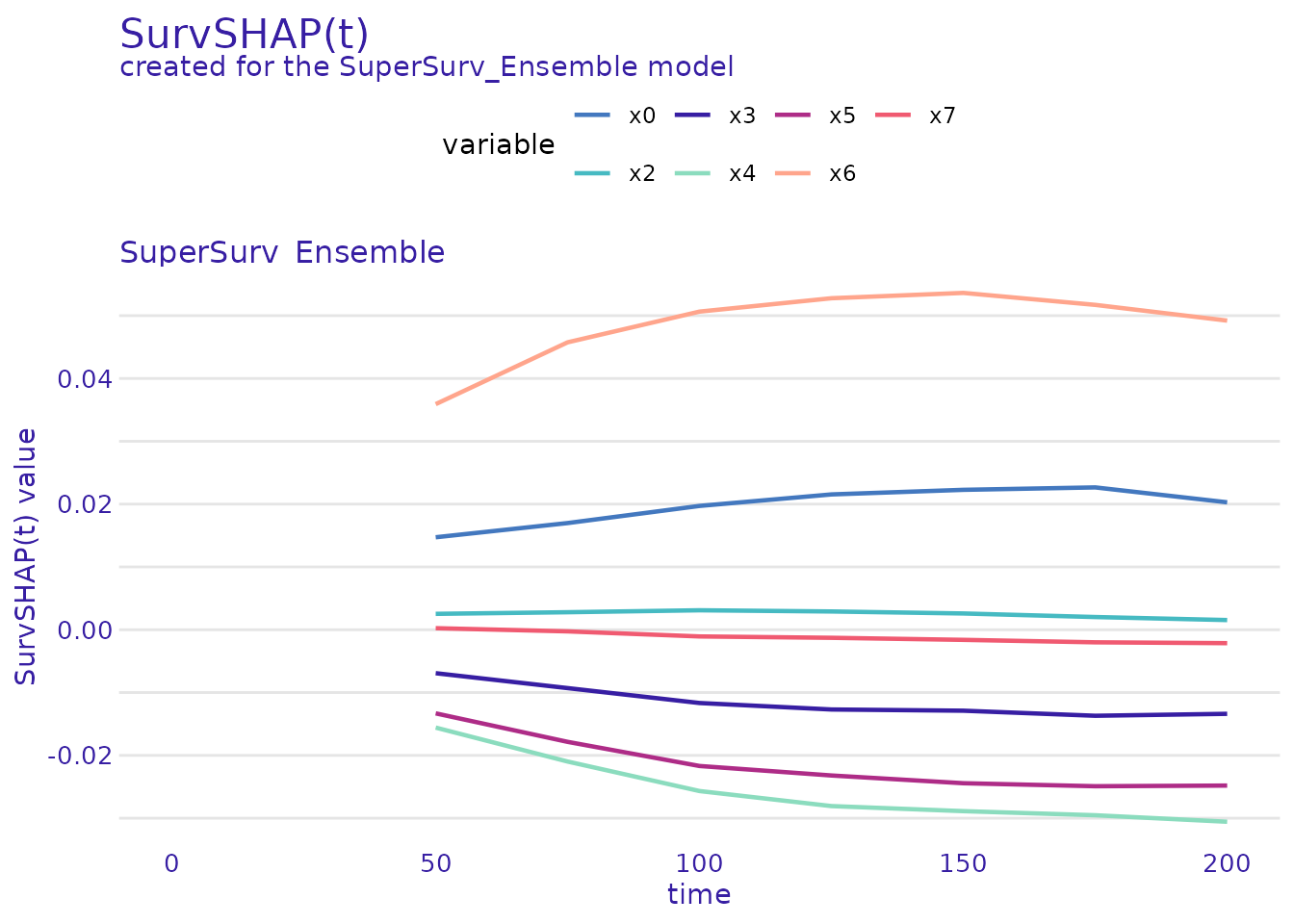 Traditional SHAP looks at an overall “risk score,” but survival analysis is fundamentally about time. A feature might be highly predictive of early mortality (Time = 50) but irrelevant for long-term survival (Time = 200).
