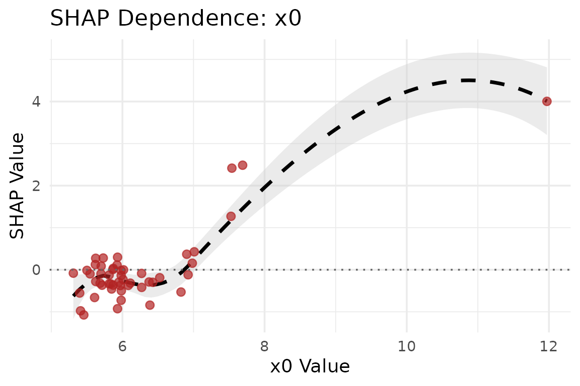 plot_dependence(shap_vals, data = X_explain_subset, feature_name = "x0")