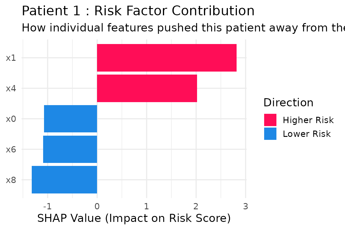 In precision medicine, we often need to explain why a specific patient has a high risk score. The Waterfall plot breaks down the exact algorithmic logic for an individual.